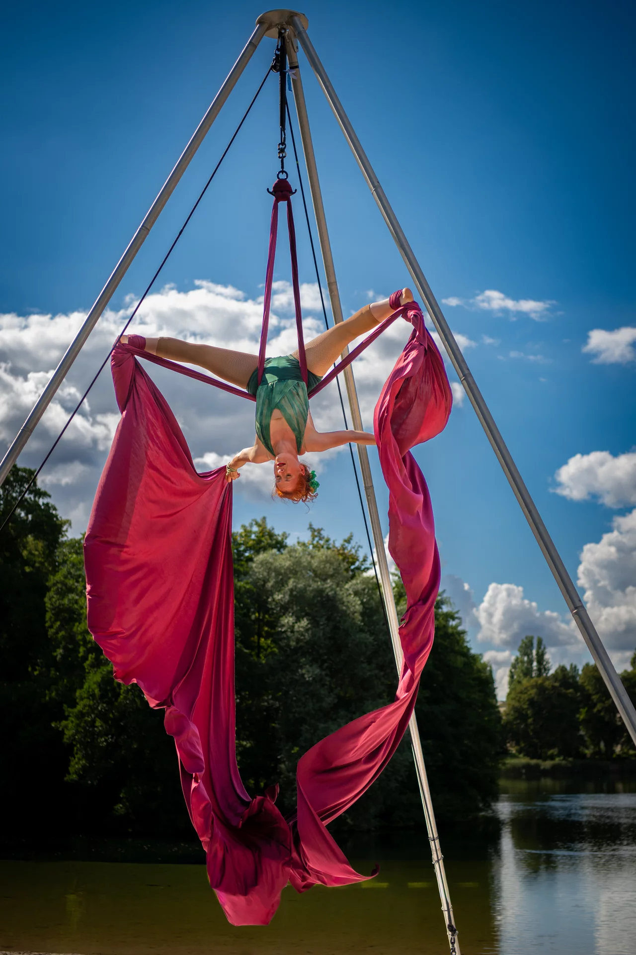 Mit Leichtigkeit klettert Anna Ehrenreich in die Höhe, knotet das Tuch um eindrucksvolle Bilder in der Luft entstehen zu lassen. Ein Spiel mit Kraft und Eleganz. Auf grazile Posen folgen atemberaubende Momente, in denen sich Anna Ehrenreich einfach metertief fallen lässt.